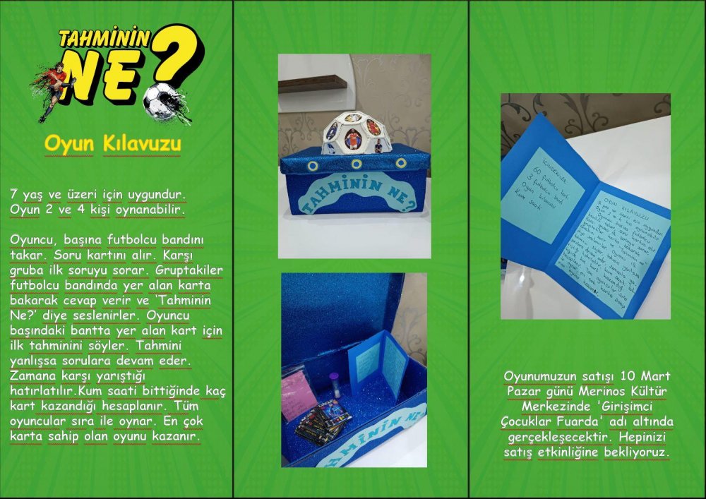 Öğrencilerimizden Ömer Faruk KURU, Yiğit Hamza KAHRAMAN ve Emin ŞENER ürettikleri kutu oyununu,10 Mart Pazar günü Merinos Atatürk Kongre ve Kültür Merkezi’nde gösterime sunacaklar.