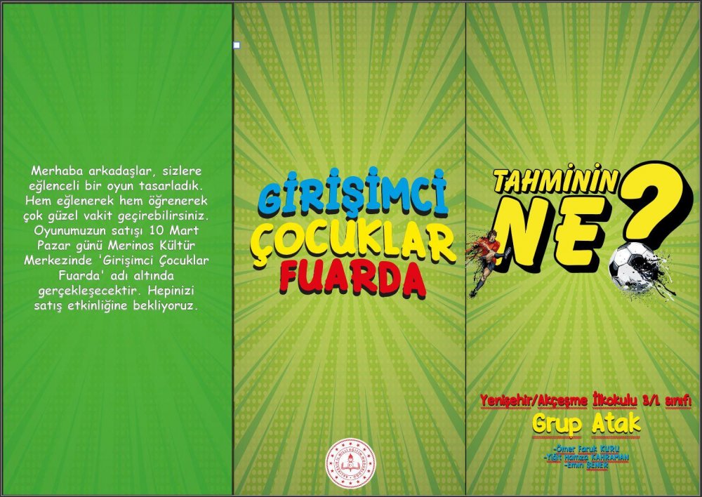Akçeşme İlkokulu 3-L Sınıfı öğrencileri Bursa İl Milli Eğitim Müdürlüğü Ar-Ge Birimi tarafından BEBKA işbirliğiyle faaliyet gösteren Bursa İnovasyon Merkezi’nin Bursa’da öğrenim gören öğrencilerin girişimcilik alanında bilgi ve becerilerini artırıp girişimcilik kültürünü erken yaşlardan itibaren oluşturmak ve yaygınlaştırmak için başlattığı “Girişimci Çocuklar Fuarda” etkinliğine tamamen kendi fikir ve tasarımlarının ürünü olan “Tahminin Ne?” isimli kutu oyunlarıyla katılacaklar.